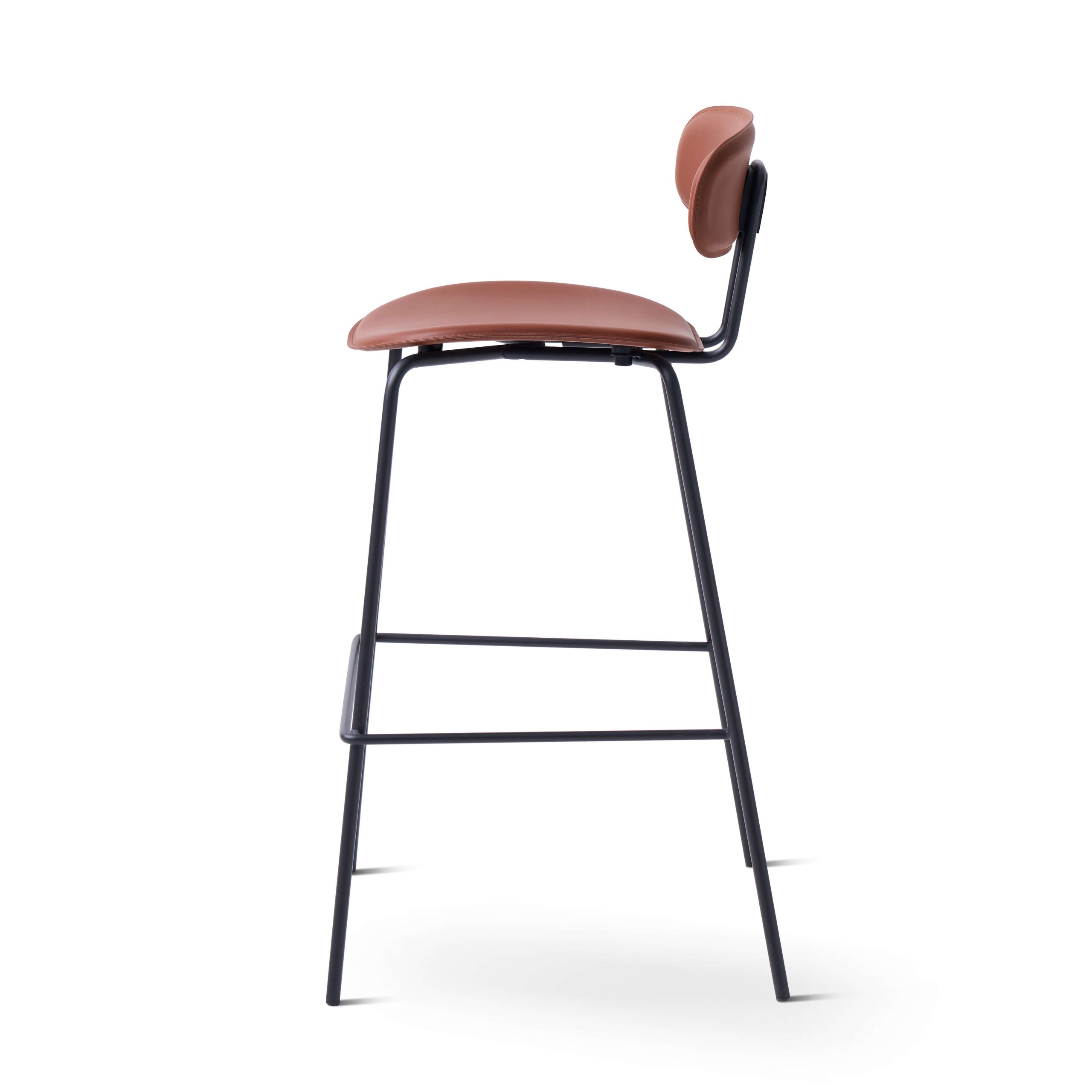 כיסא בר נקי ומינימליסטי מרגלי מתכת דקיקות צבועות בתנור בגוון שחור מט בשילוב מושב ומשענת דמוי עור גוון חמרה בנוחות מקסמילית