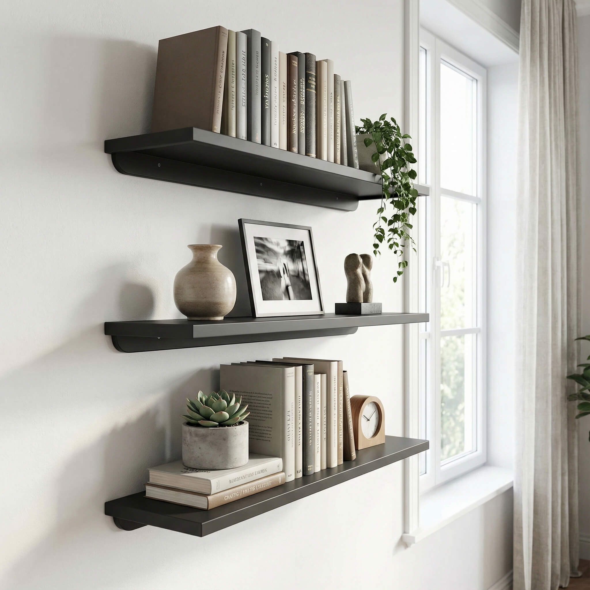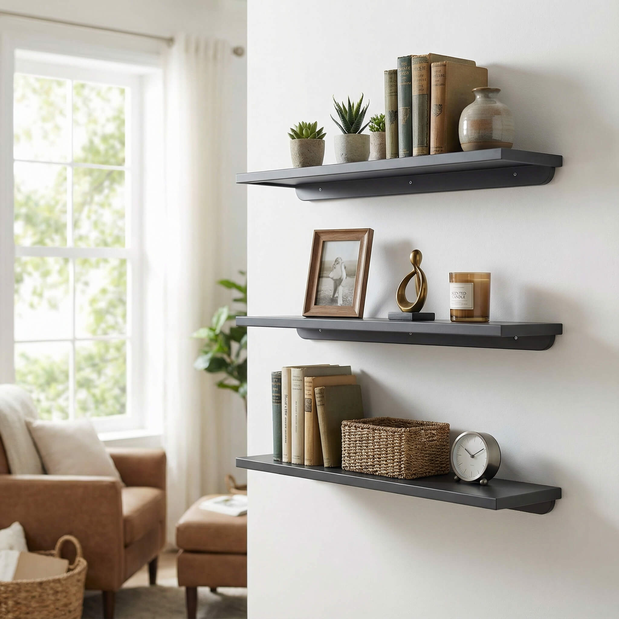 מדף עץ בצביעה אטומה בתנור בגוון גרפיט חלק ומושלם במגוון מידות לבחירה מגיע עם ברגים ודיבלים לתליה במשלוח מהיר עד הבית