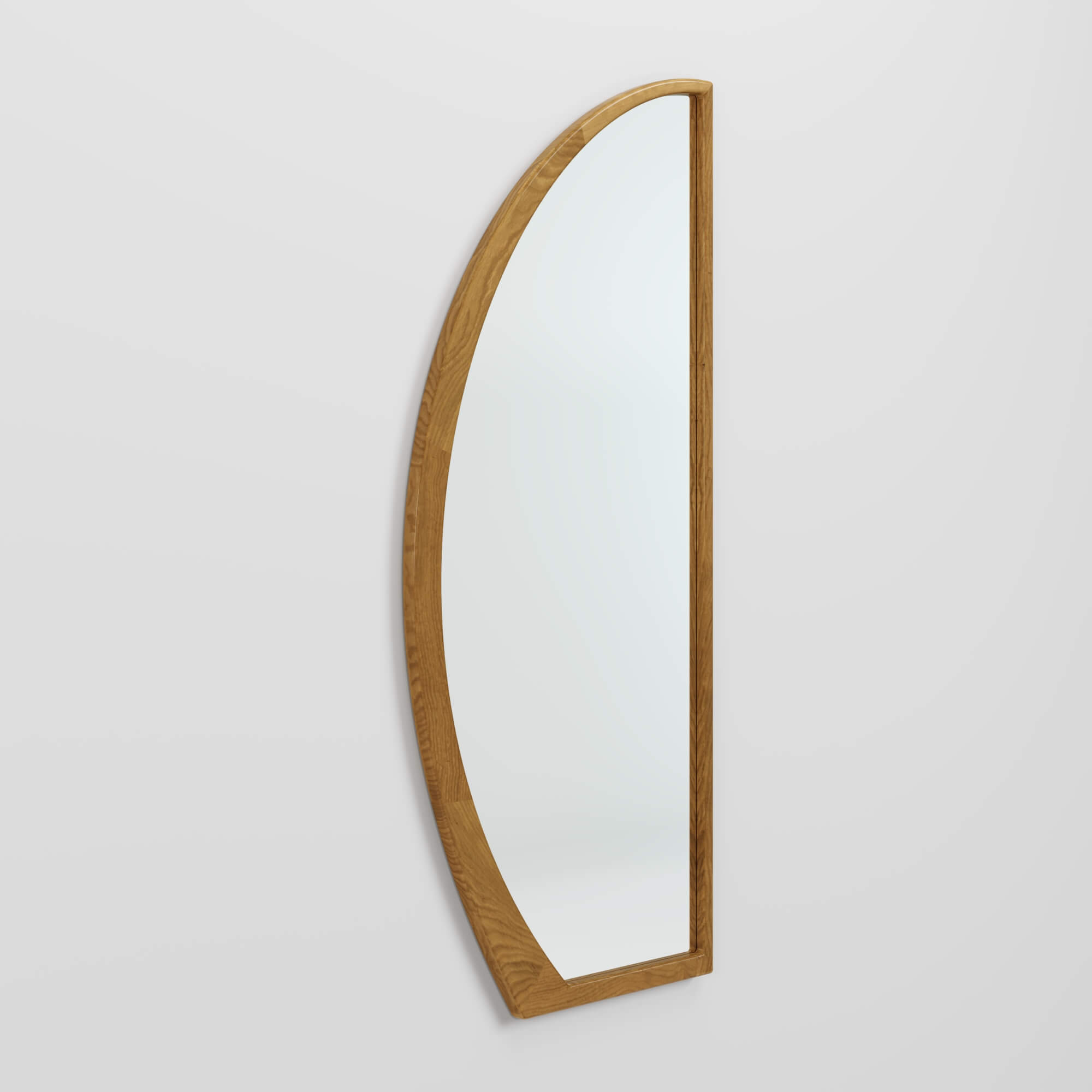 מראת Half Moon מעץ מלא בצורת חצי ירח בגימור לכה טבעית בגודל 180 ס"מ בגימור מושלם, לשדרוג החלל בנוכחות מרשימה
