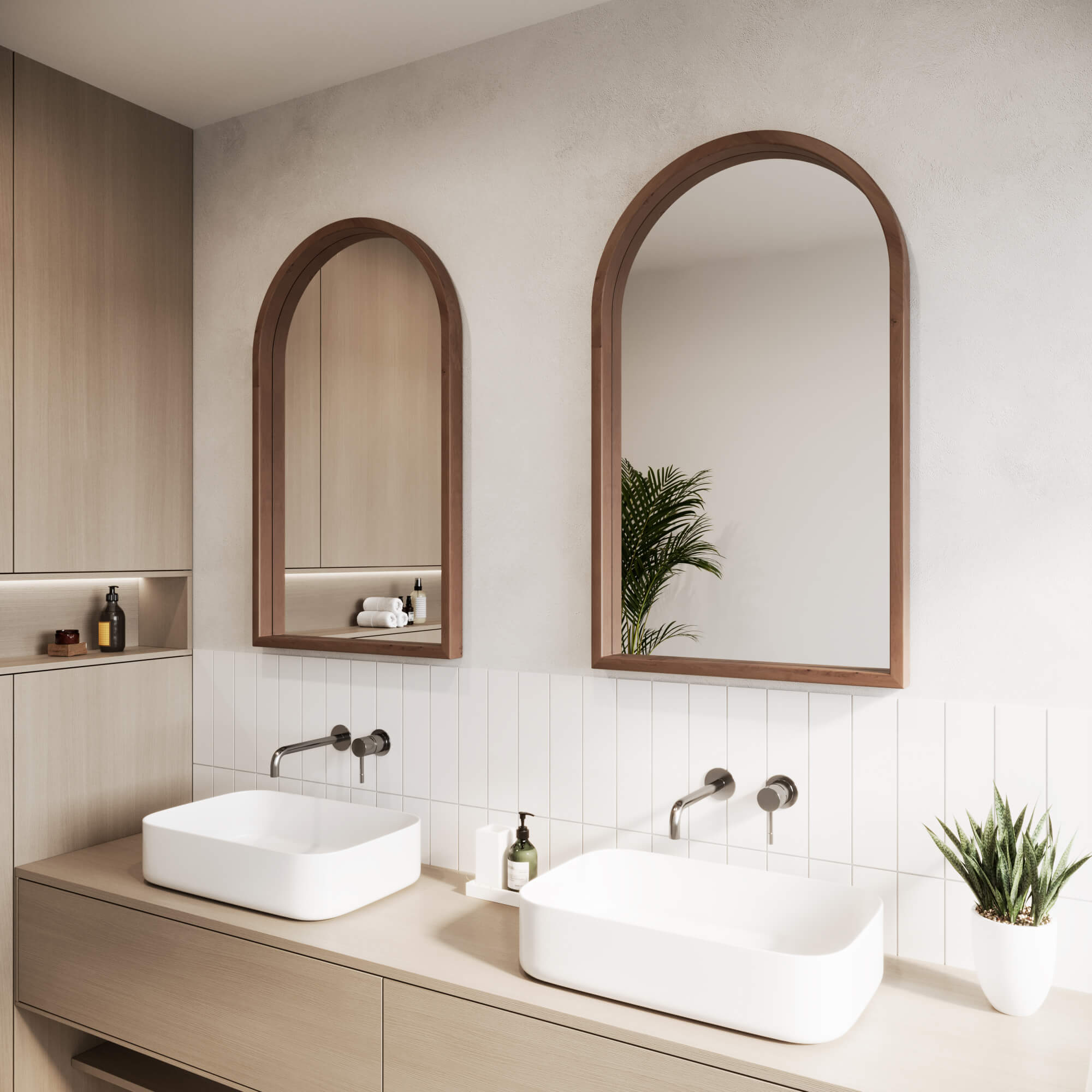 מראה עץ בצורת קשת בגימור מושלם מעץ טבעי גימור איגוז אמריקאי בצבע בלכה מט
